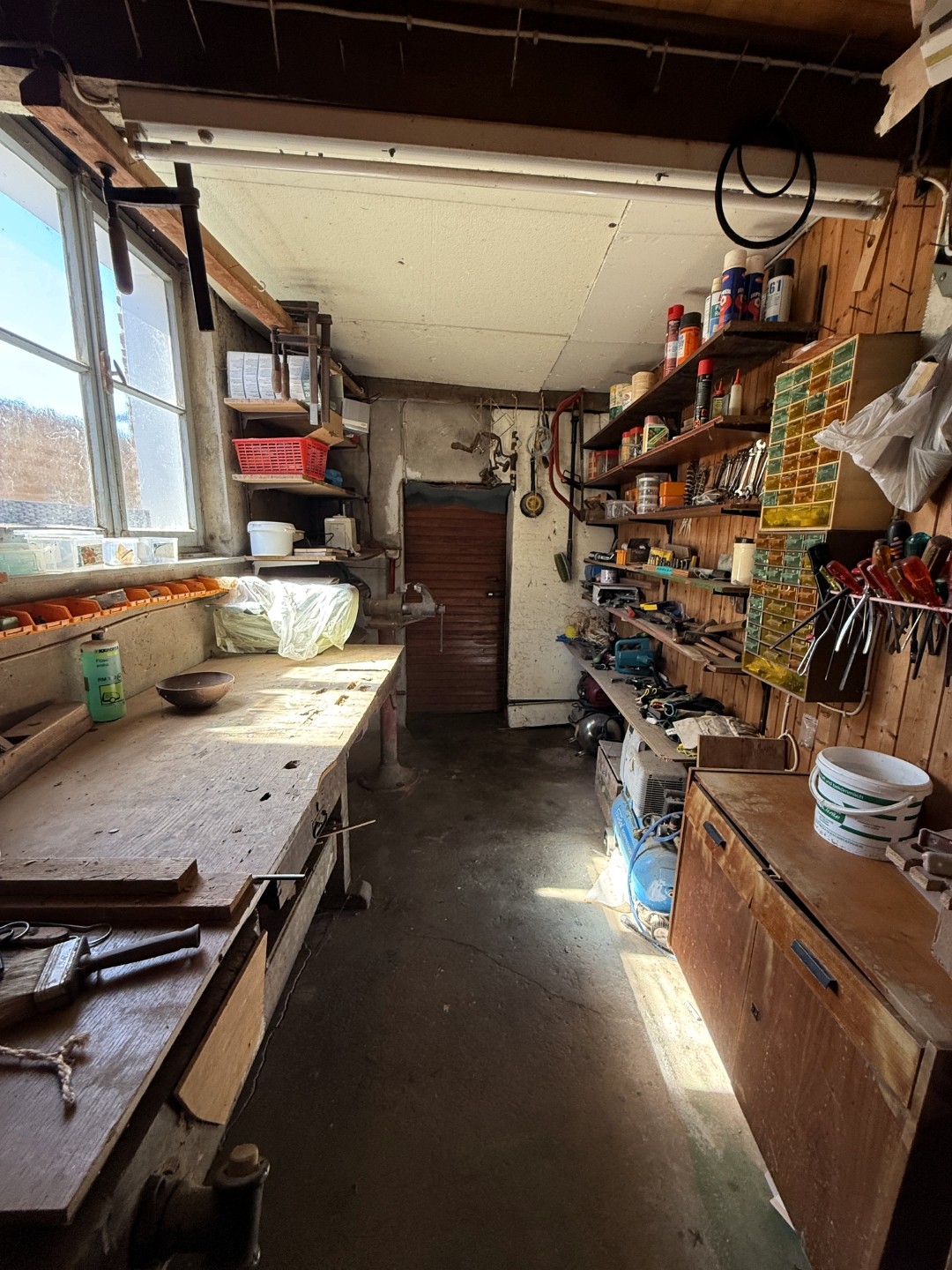Das angrenzende ehemalige Stallgebäude dient heute als praktische Werkstatt und Abstellbereich.