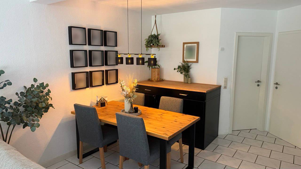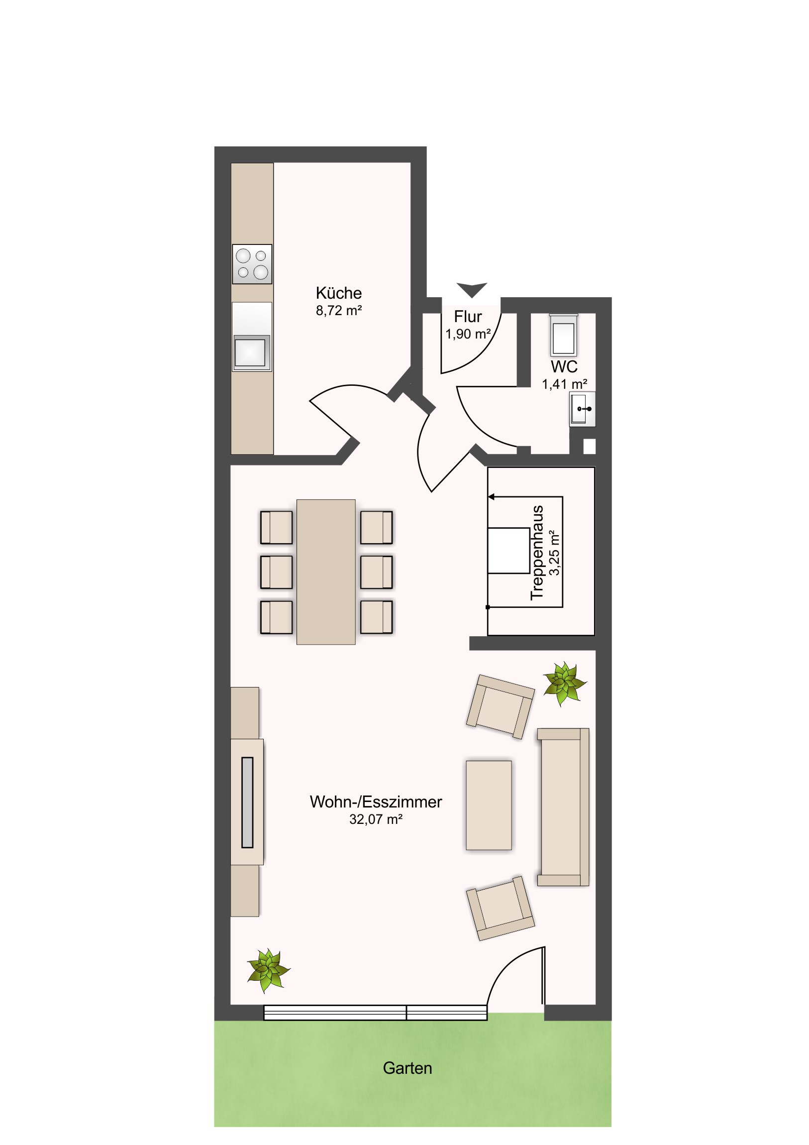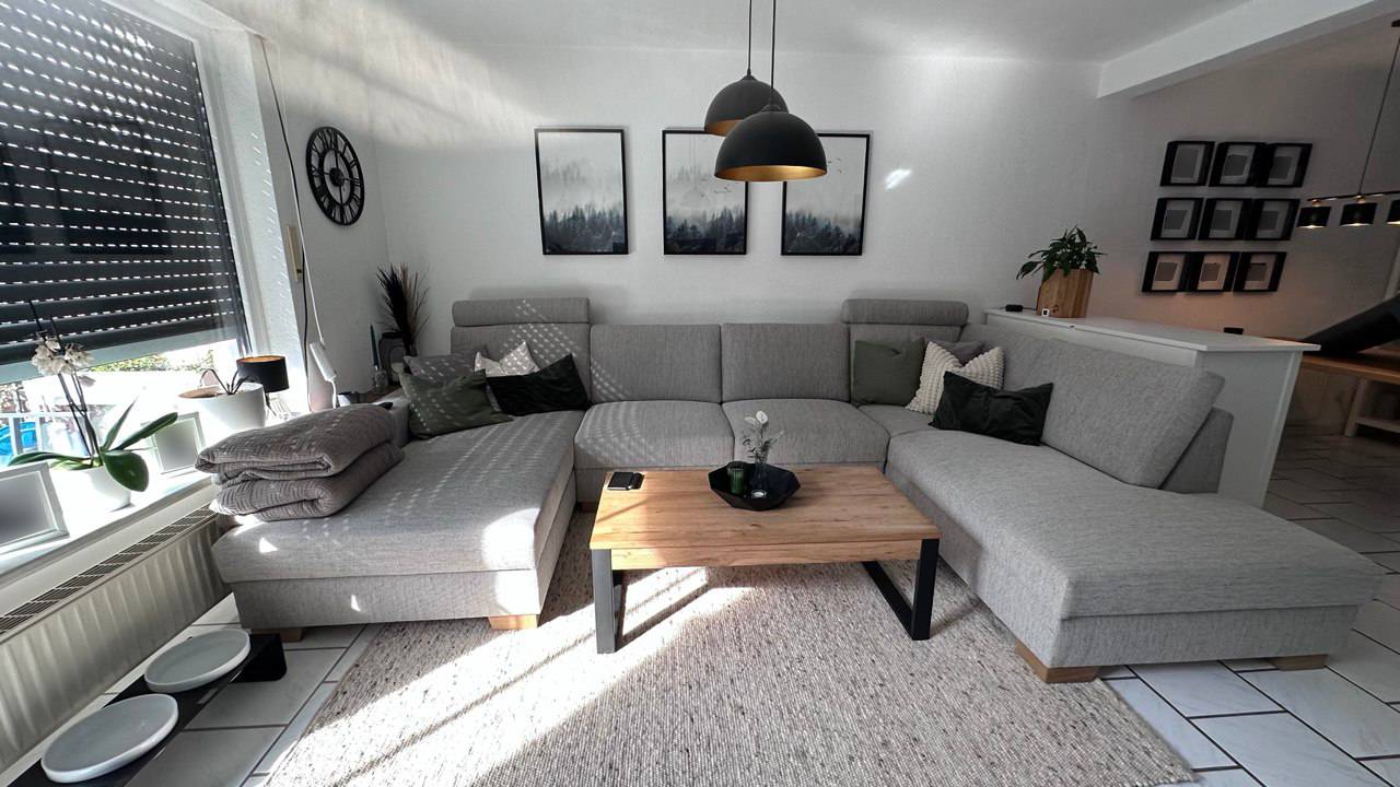Im Erdgeschoss betreten Sie zunächst einen kleinen Flur, der direkt in das Herzstück des Hauses führt: den großzügigen, lichtdurchfluteten Wohn- und Essbereich. Hier findet das Familienleben seinen Mittelpunkt – offen, freundlich und mit Blick ins Grüne.