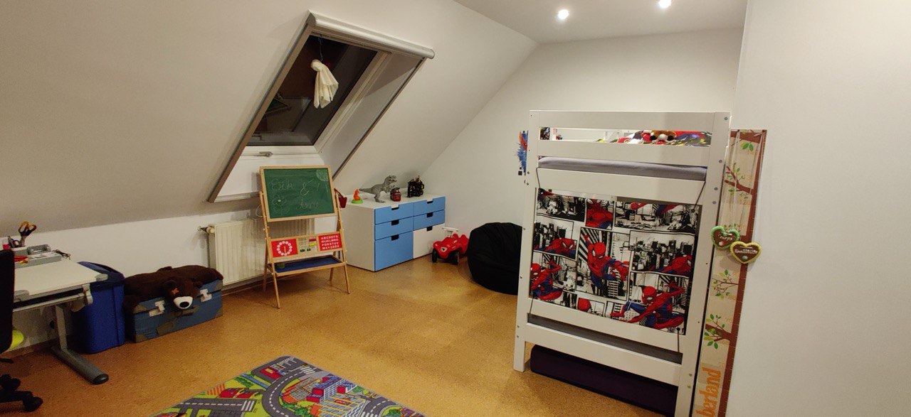 Im Dachgeschoss befinden sich zwei gut geschnittene Zimmer, die sich ideal als Kinderzimmer, Schlafzimmer oder Arbeitsräume nutzen lassen. Das Badezimmer bietet mit Dusche und Badewanne großzügigen Komfort – perfekt für das tägliche Familienleben.