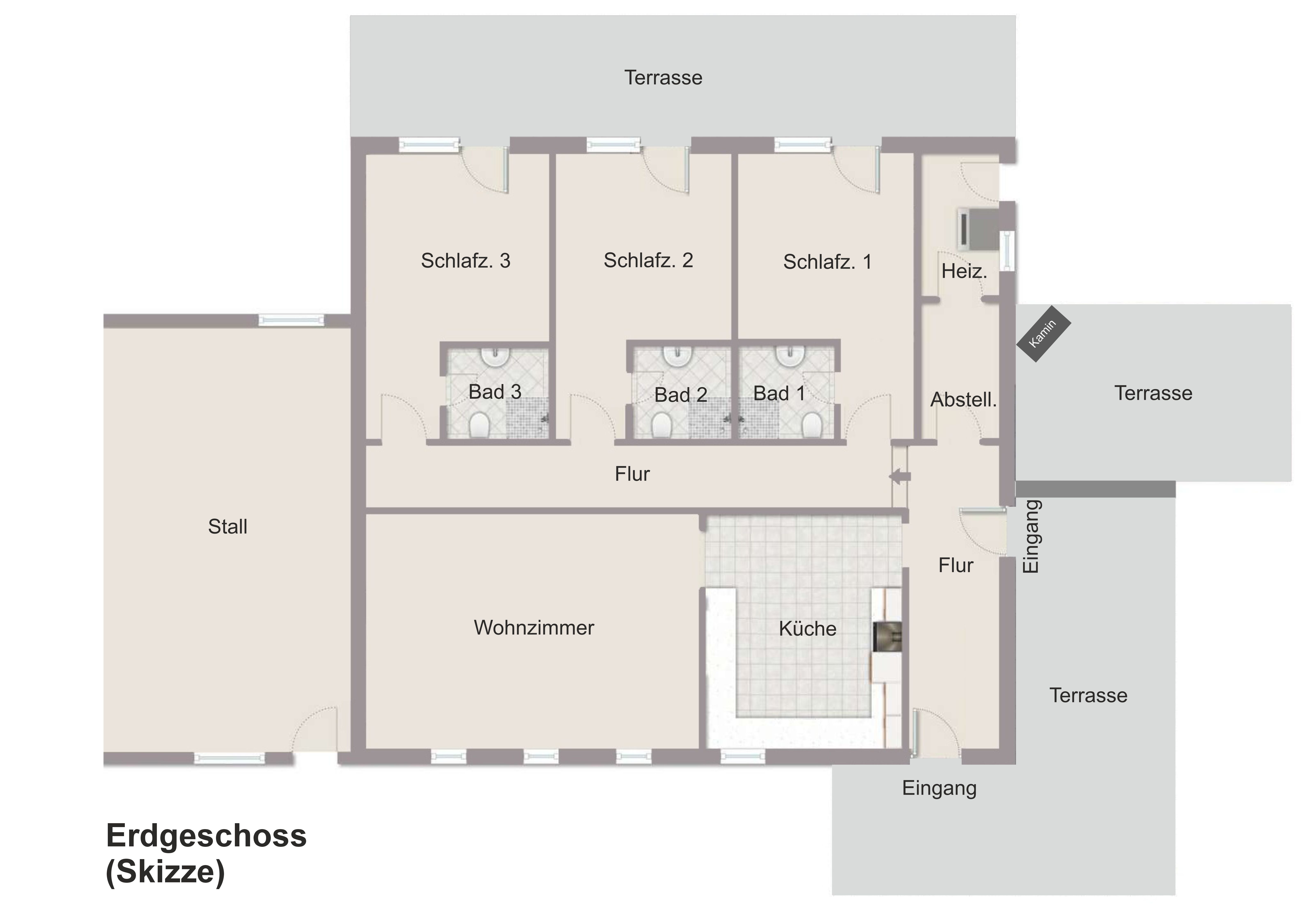 Eingangsbereich, Flur, Küche, Wohnzimmer, 3 Schlafzimmer mit jeweiligem Bad, Abstellraum, Heizungsraum, zwei überdachte Terrassenbereiche