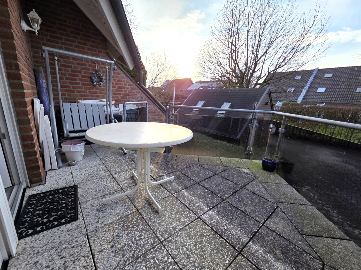 Vom angrenzenden Balkon führt eine Außentreppe direkt in den hinteren Grundstücksbereich. Dort befindet sich das gemeinschaftlich genutzte Gartenhaus, das als praktischer Fahrrad- und Abstellraum dient.